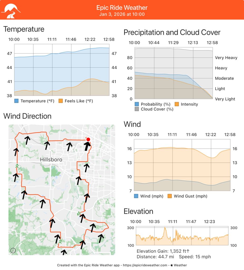The forecast is temperature from 46°F to 48℉, overcast, light rain. 8 mph breezes gusting to 16 mph.