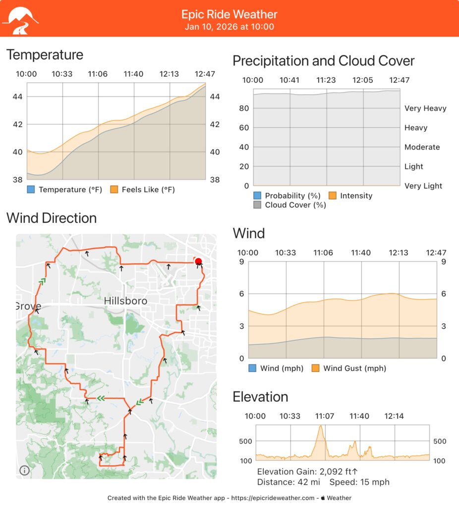 The forecast is temperature from 38°F to 45℉, overcast and light breezes.