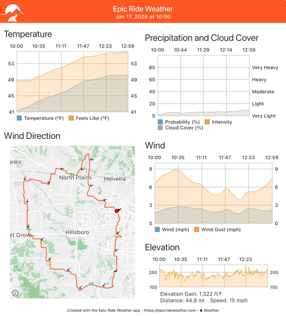 The forecast is temperature from 40°F to 50℉, overcast and light breezes.