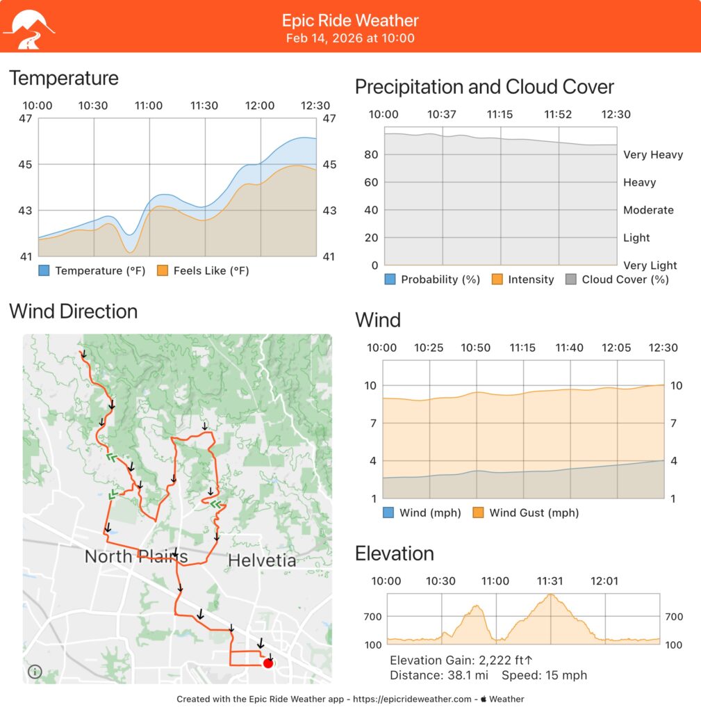 The forecast is temperature from 41°F to 46℉, overcast and light breezes.